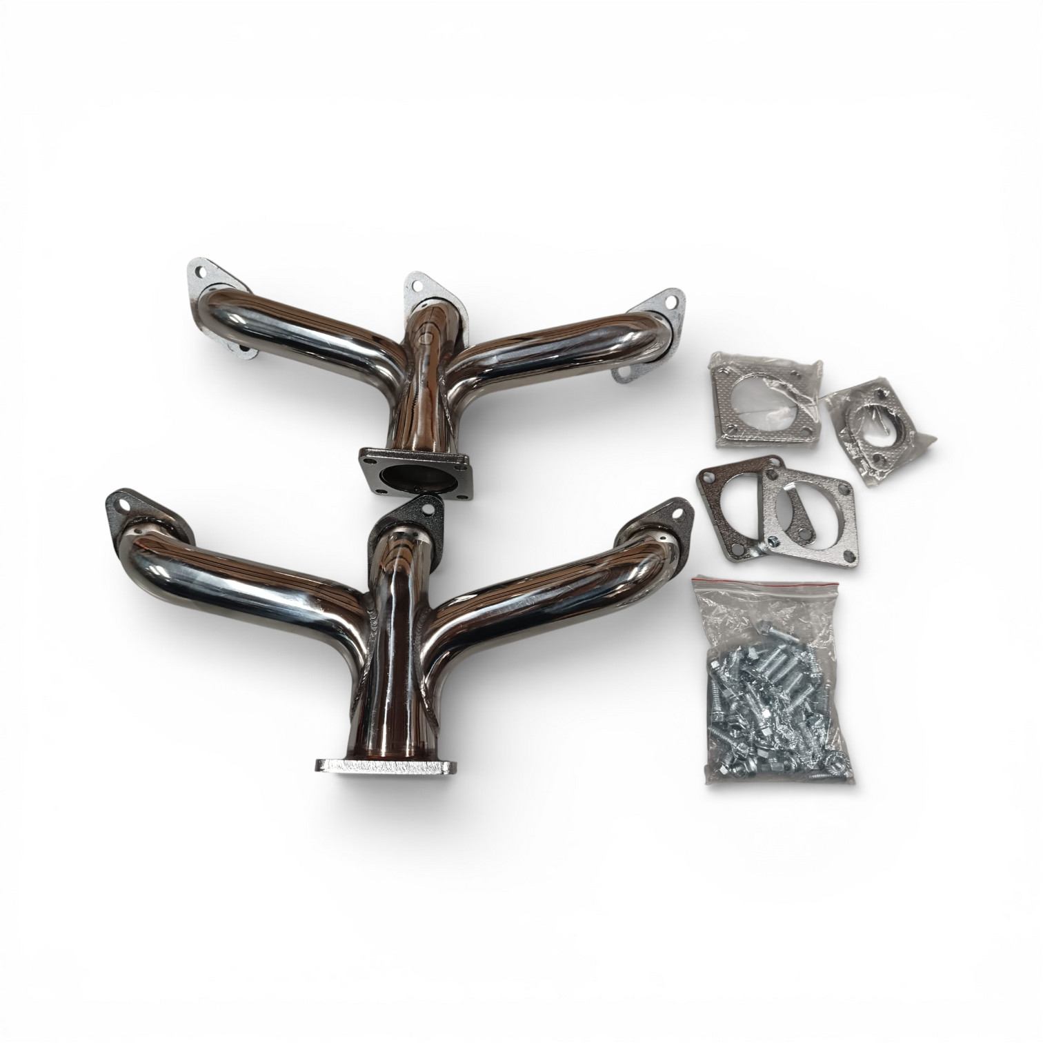 Headers for flathead Ford V8, stainless steel. Includes bolts and gaskets. Sold in pairs.